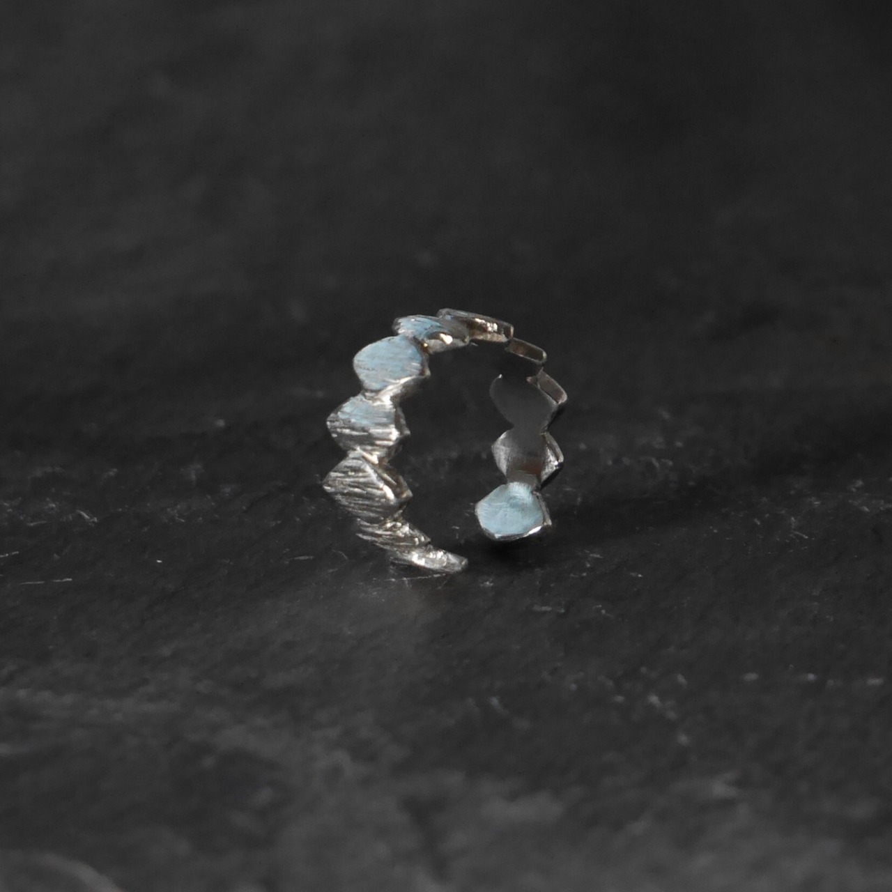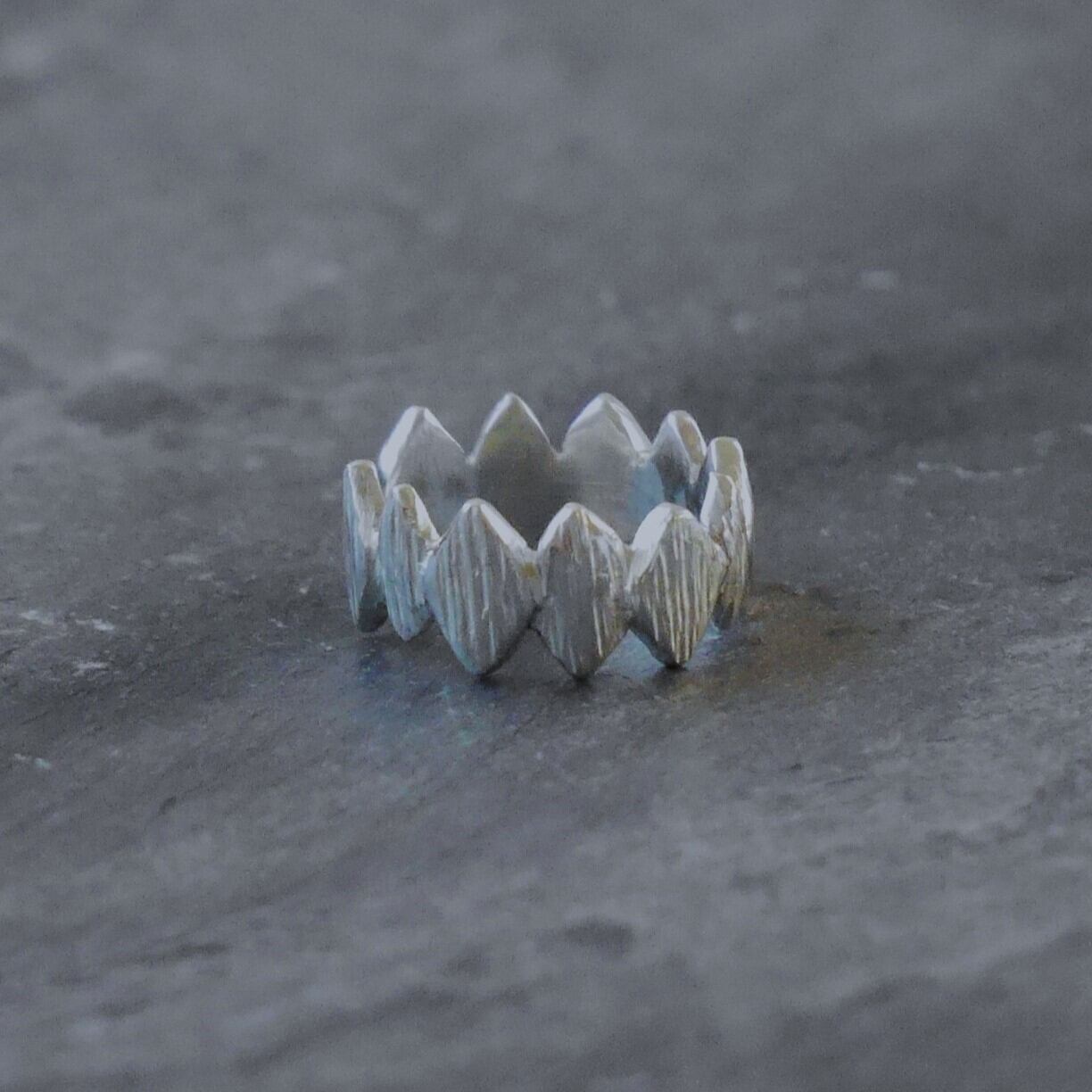 ひし形表面に無造作にいれた縦線の効果で、自然石のような重厚感が増し耳元を引き立てます。